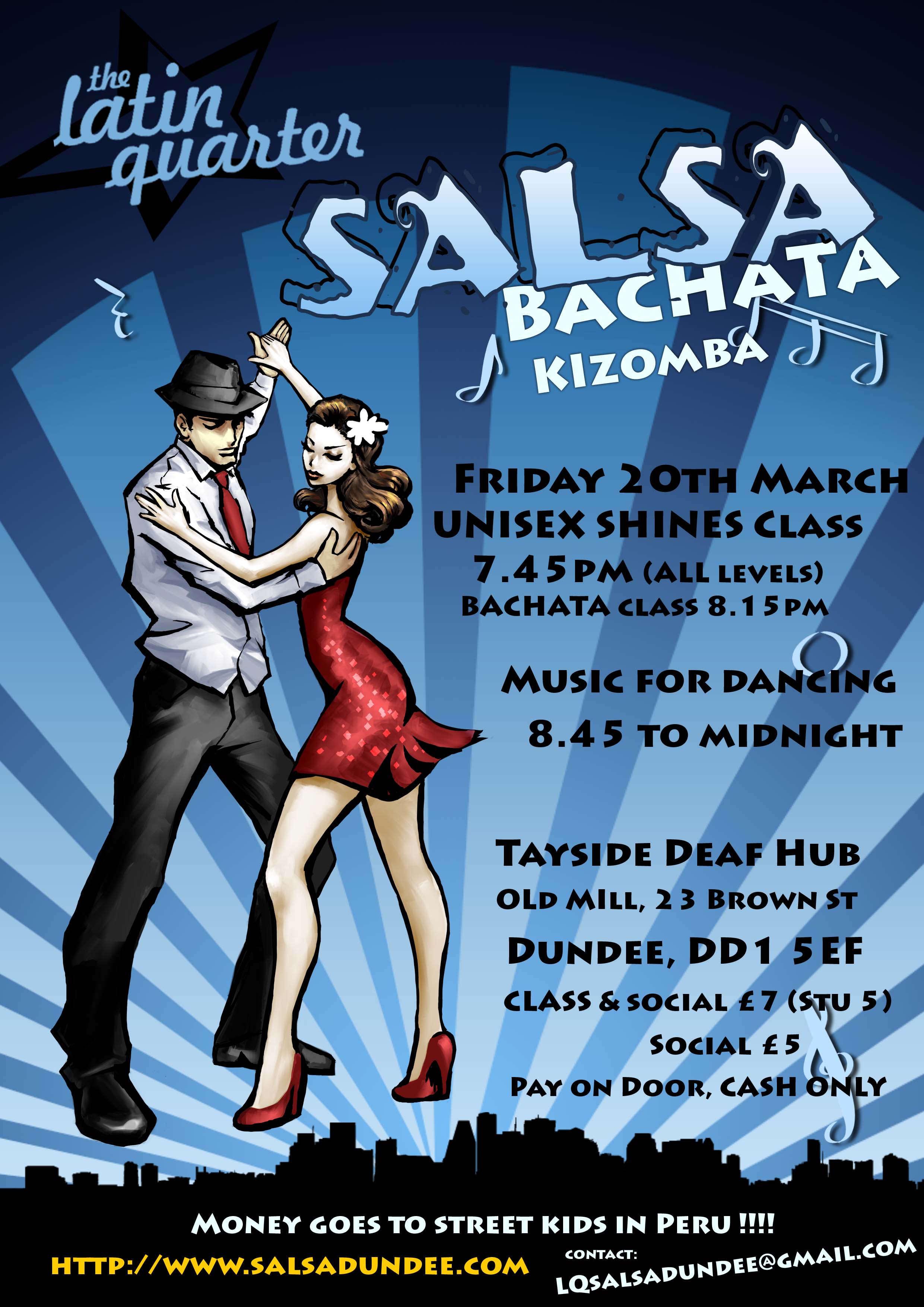 LAST week to join Latin Quarter Beginners Salsa class Tuesday 20th January, 6.15-7.15pm, at The Deaf Hub, Old Mill, 23, Brown St, Dundee. DD1 5EF, Please email LQsalsadundee@gmail.com to book a space. 10 week block pass £45 ( less £4.50 in week 2) or £6 per class weekly. CASH ONLY. Beginners class dancers please come 10 to 15 min early to register & pay. Classes are progressive, anyone welcome, no partner necessary. Directions to Deaf hub on class page at http://www.salsadundee.com. Please pass the word. All money raised for Azul Wasi home for former street children in Peru.