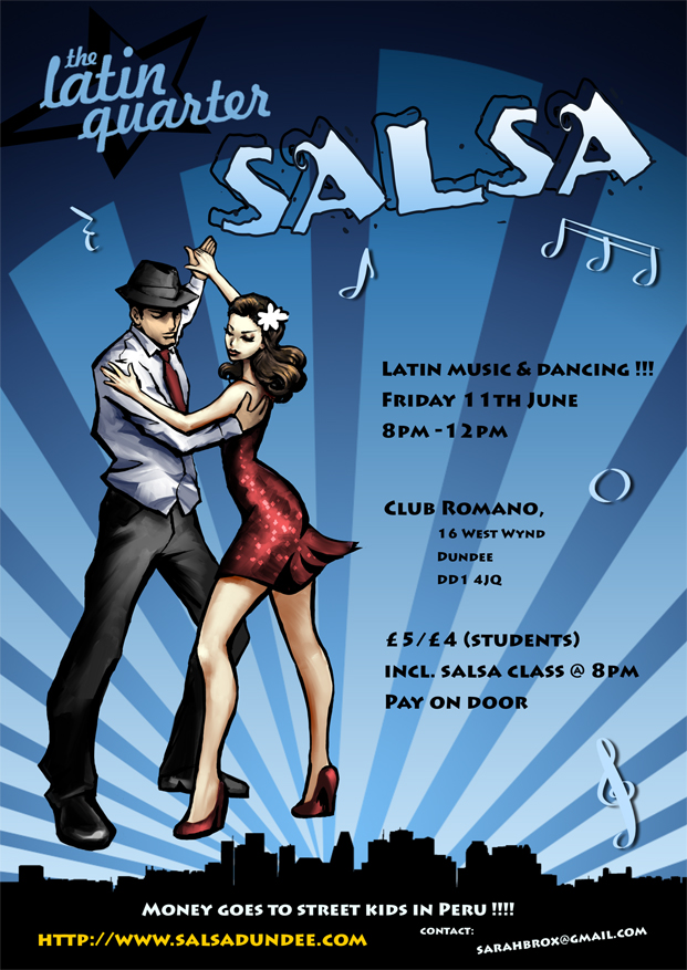 Latin Quarter Salsa & Latin dance social night, at Club Romano, West Wynd ( off Perth Rd, near Dilsee restaurant), Dundee , 8-12pm, £5/£4 (students). Beginners salsa class 8.15pm. Come along & have fun while raising money for the Azul Wasi street children project, near Cusco, Peru. See page on the this website for more details of the charity. Email sarahbrox@gmail.com for more info.   Check out the NEW posters below, many thanks to Gerard & Martyn for these.  Please click on them to print off  inf you can pop one up somewhere or email to others to pass the word.