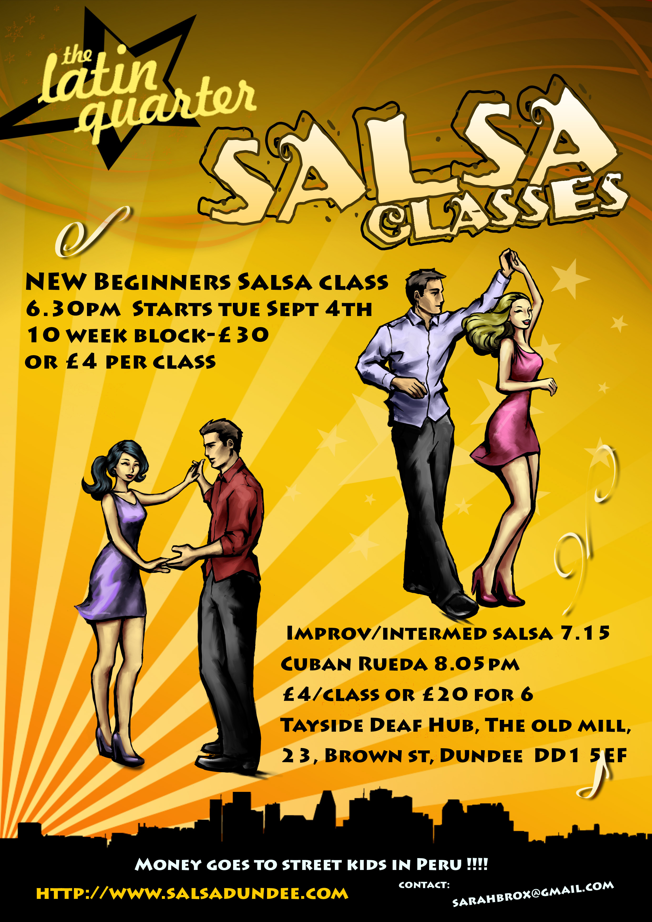 NEW Tuesdays Beginners salsa class (10 week block) starts Tue Sept 4th, 6.30-7.15pm at Tayside Deaf Hub, Old Mill, 23 Brown St, Dundee DD1 5EF. Come along spice up your life and learn latin rhythms ! 10 week block £30, or £4 per week. All money goes to Azul Wasi, a small home for 14 former street children in Peru. Can join first 2 weeks only. No partner necessary, anyone welcome. Please pass the word if you can. Email sarahbrox@gmail.com to register & reserve a space.