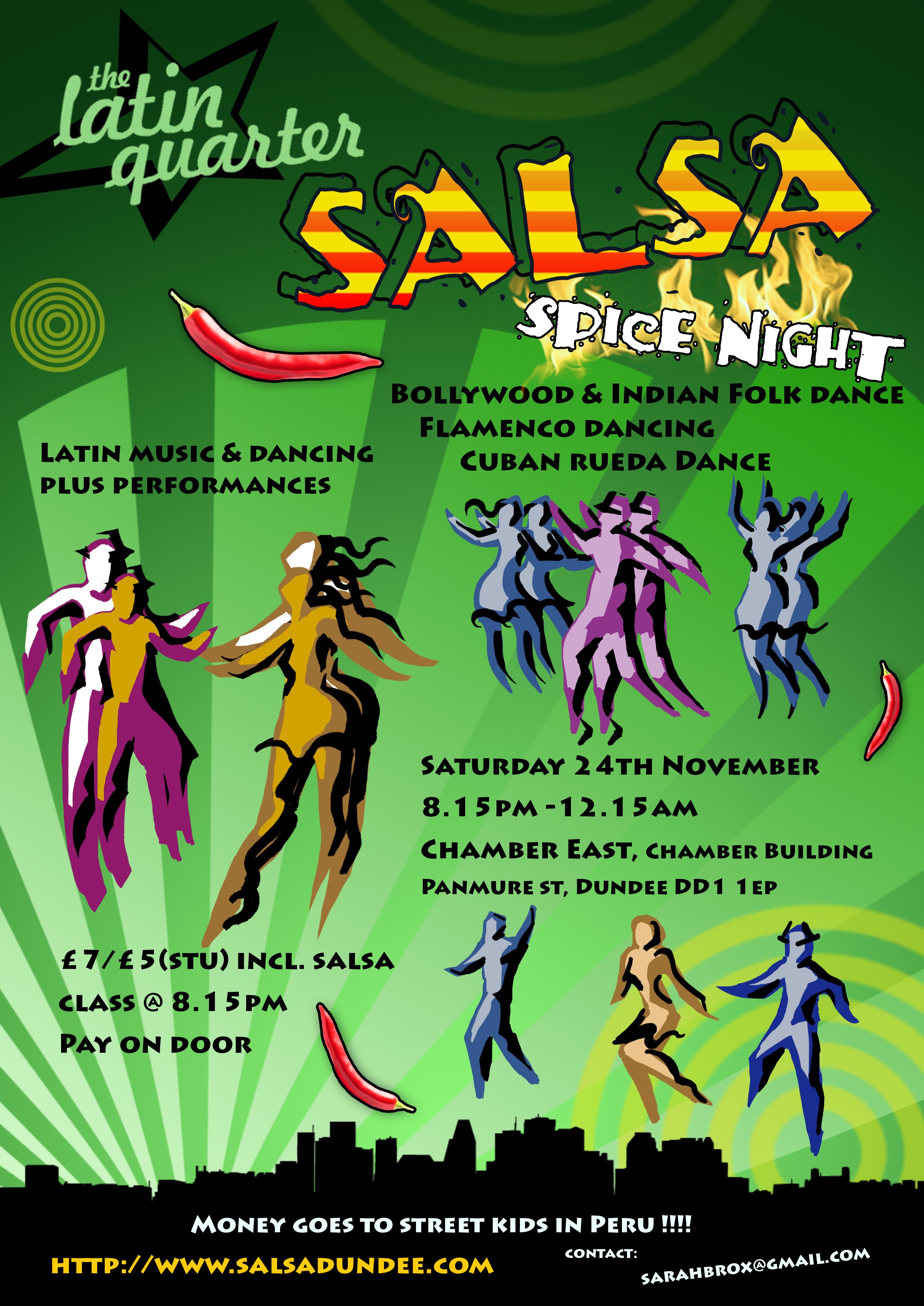 Latin Quarter SPICE night – Fri 23rd June @ Chamber East, Chamber buildings, Panmure St Dundee DD1 1EP (behind the McManus galleries). There will be latin music to groove too, an Argentine tango taster class (8.15pm), Tribal belly dancing performance ( later in Eve), and a Beginners taster salsa class at 7.30pm. Chamber East has a lovely big wooden dance floor, anyone welcome, bring friends & family. Doors open 7.30pm, on till 12.30am. Entry £8 full price or £5 for students, pay on door or tickets from Tuesday Deaf Hub salsa classes. There will be a raffle too. All money raised goes to the Azul Wasi project for former street children in Peru. Email LQsalsadundee@gmail.com for more details.