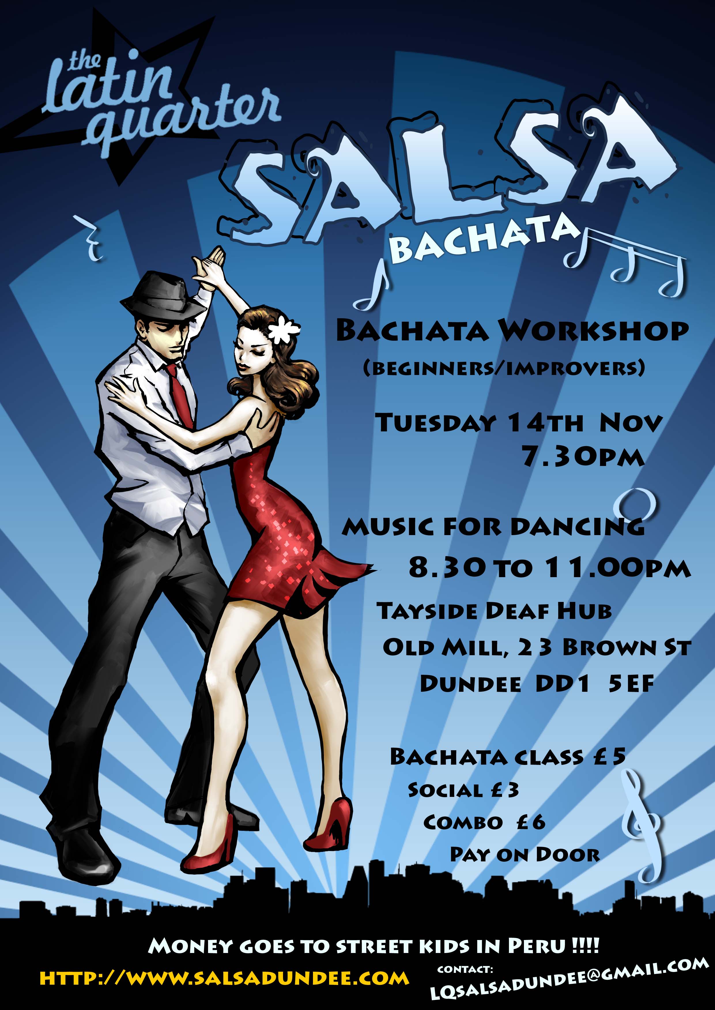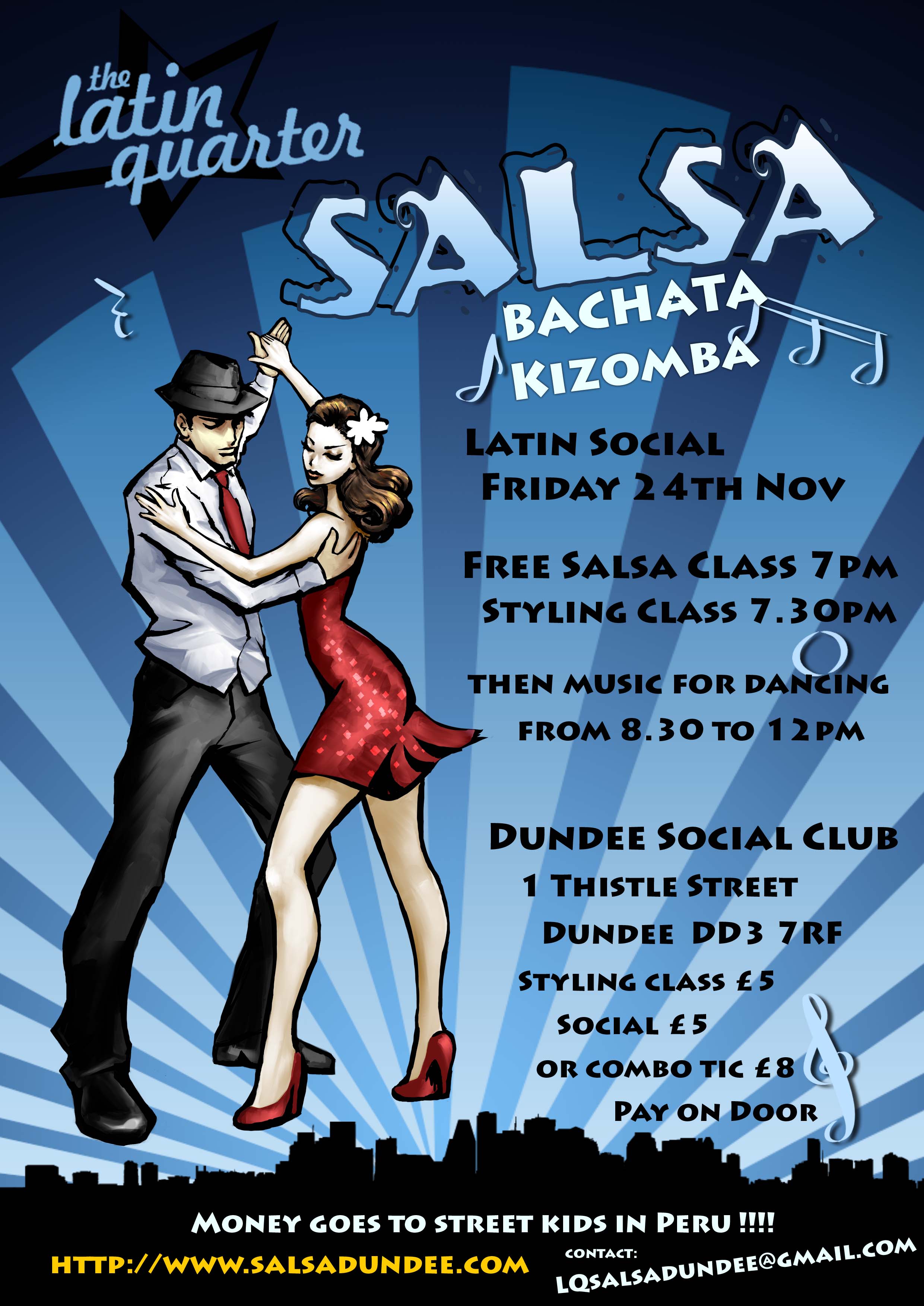 There will be a bar and a raffle. Raffle prizes are gratefully appreciated. Email LQSalsadundee@gmail.com for more details. Also see Salsa Dundee -Latin Quarter facebook group. Please pass the word, pop a poster up if you can, everyone welcome.