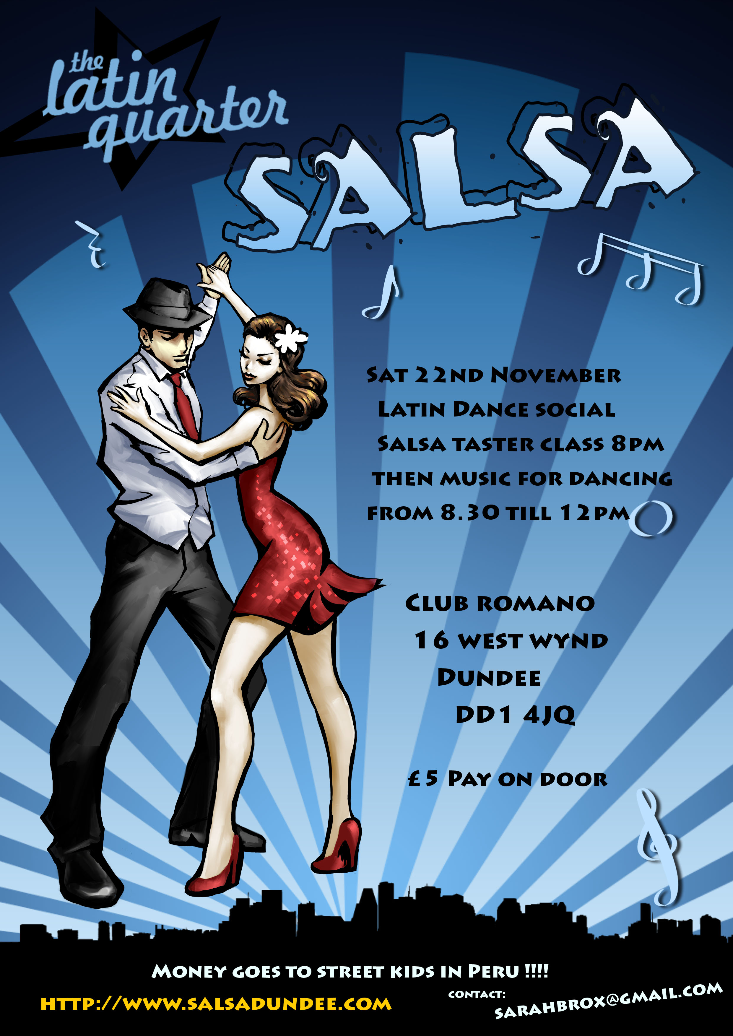 Latin Quarter latin social, sat 22nd Nov, 8pm till 12pm @ Club Romano, 16 West Wynd, Dundee DD1 4JQ ( just off Perth Road, near Dilsee restaurant) If you’re new to Latin Quarter, its a latin night with music to dance to with a free beginners salsa class at 8pm. Pay on the door £5, all money raised goes to help the Azul Wasi street children project in Peru. See charities tab on website for more details about Azul wasi. Please pass the word, pop up a poster if you can. There will also be a raffle on the evening, come ans spice your life up with a little latin spirit, anyone welcome, bring friends & family too.