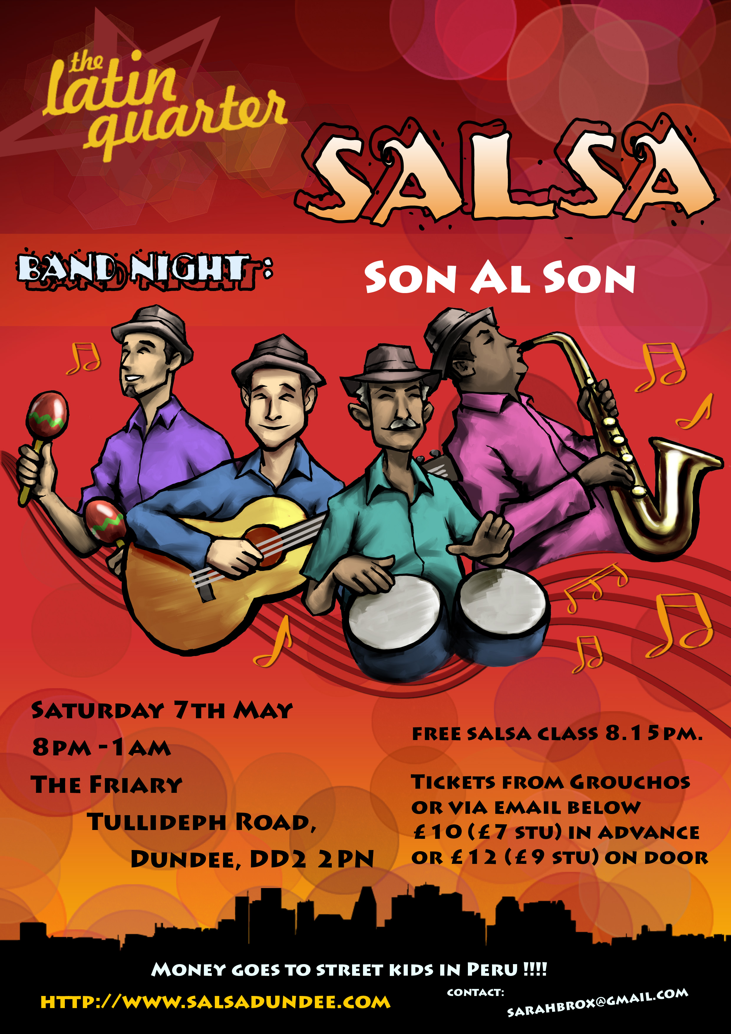 Tickets on sale now for LATIN QUARTER CHARITY SALSA BAND NIGHT with Son Al Son, Latin band on Sat 7th May at The Friary, Tullideph Rd, Dundee DD2 2PN   Doors open 8pm, salsa beginners class at 8.15pm, on till 12.30am.  Raffle too.  Venue has large wooden dance floor.  Money raised for the Azul Wasi project for street children near Cusco, Peru.