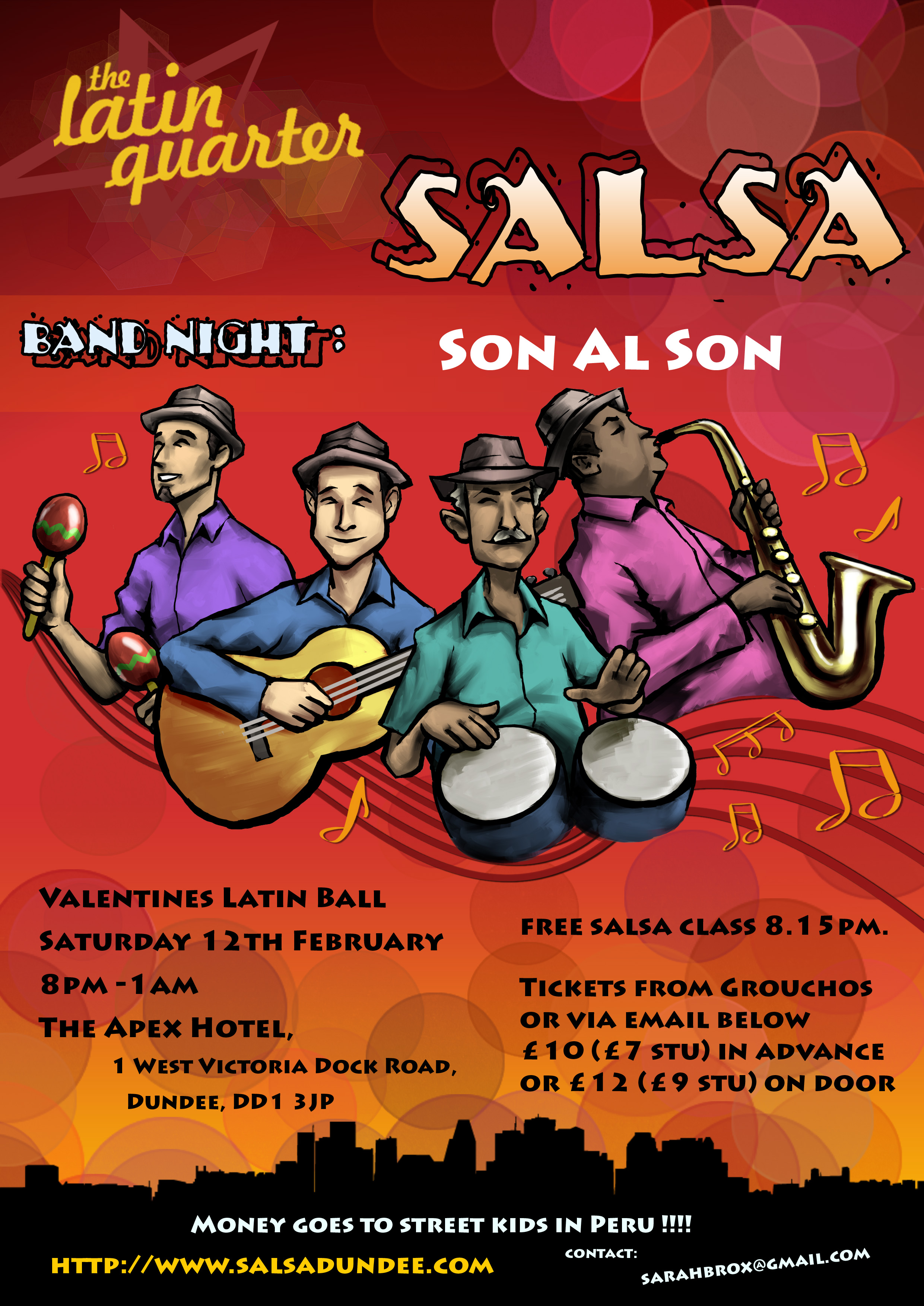 TICKETS ON SALE NOW for the CHARITY LIVE BAND Valentines Ball at The Apex City Quay Hotel & Spa, 1 West Victoria Dock Road, Dundee, DD1 3JP on Saturday February 12th 2011, doors open at 8pm on till 1am. SON AL SON, Cuban music band are bringing a little bit of Havana to you. For new comers to Latin Quarter band events there’s a beginners salsa class at 8.15pm to get the night going then Son al Son will play 2 sets starting around 9pm. There’s also a raffle & auction with some gifts straight from Cuba. In between band sets popular latin music such as Salsa, bachata, merengue is played to get you up dancing or just relax & enjoy the music. Please pass the word and bring friends.